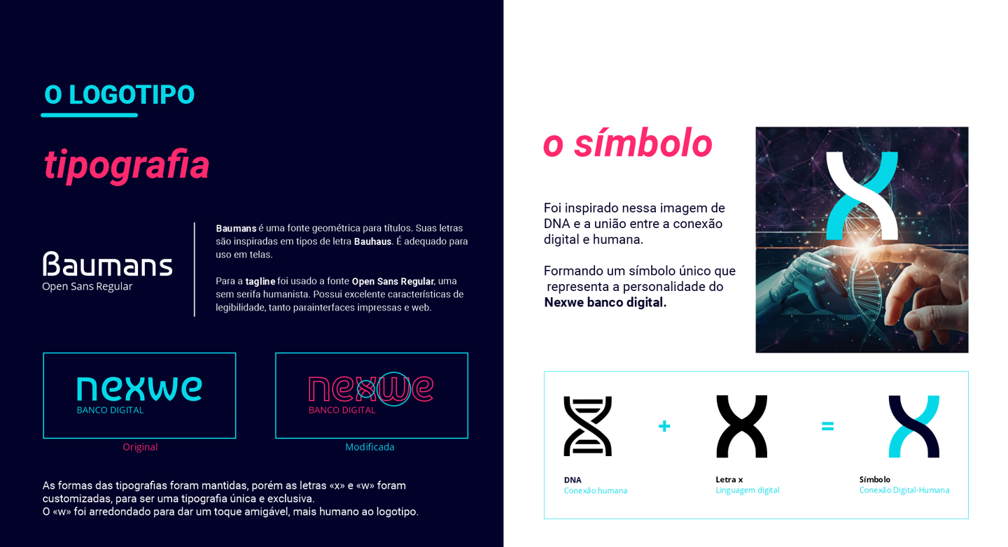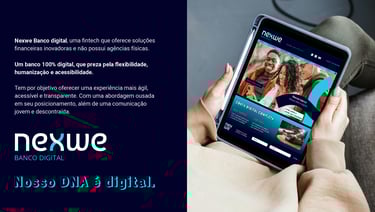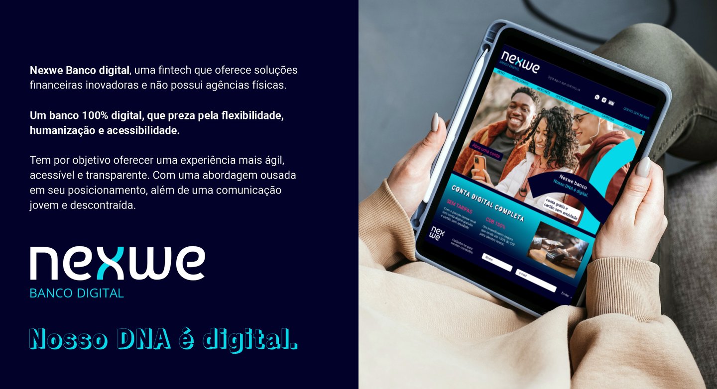 Projeto de identidade visual da Nexwe Banco Digital, uma fintech que oferece soluções financeiras inovadoras e não possui agências físicas. Um banco 100% digital, que preza pela flexibilidade, humanização e acessibilidade. Com uma abordagem ousada em seu posicionamento, além de uma comunicação jovem e descontraída.